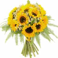 Букет «Долгожданное счастье» прекрасно составлен из подсолнухов, ромашек и амбреллы, которая достаточно оригинально и тонко подчеркивает прелесть композиции своими вычурными продолговатыми листками. Этот букет, принесенный в подарок близким, поможет выразить все тепло и радость встречи после долгой разлуки и без лишних слов покажет вашу любовь.